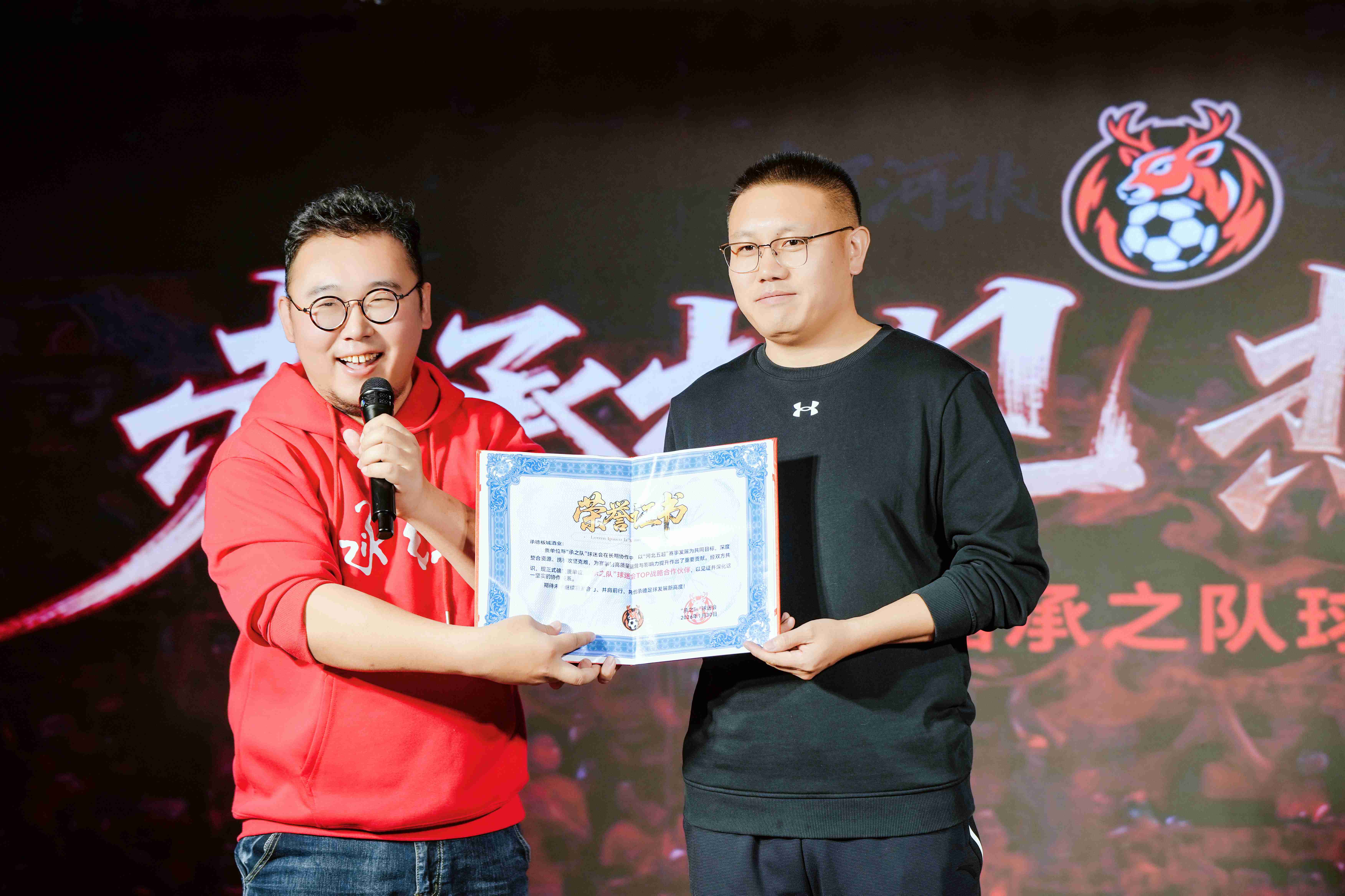 致辭結(jié)束后,現(xiàn)場舉行了授牌儀式,承德新鮮事兒創(chuàng)始人、“承之隊”球迷負責人朱孟博向板城酒業(yè)授予了“TOP戰(zhàn)略合作伙伴”榮譽證書,以表彰其長期以來的鼎力支持與深度協(xié)作,共同推動承德足球事業(yè)的發(fā)展。這一榮譽,見證著雙方深厚的情誼與堅實的伙伴關(guān)系。